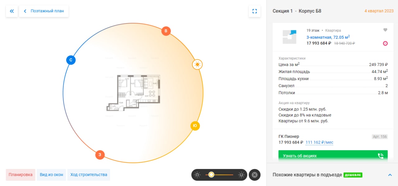 Помимо расположения квартиры на этаже, её инсоляции и видов из окон, можно сразу увидеть действующие акции и подсказку, если в подъезде есть квартиры дешевле. 💰