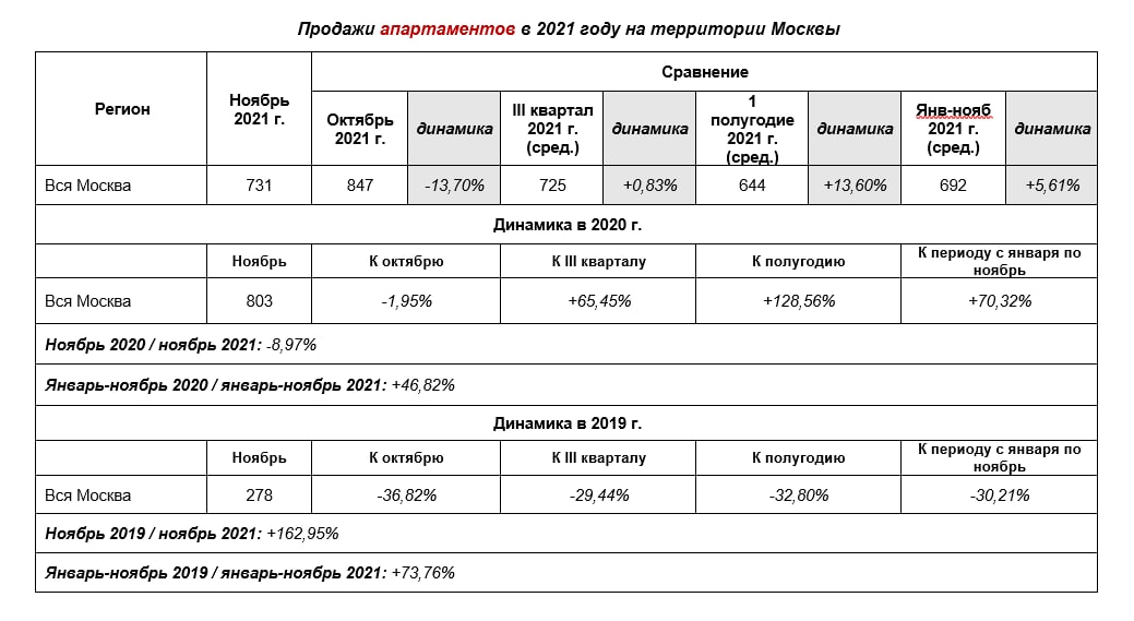 Если смотреть на средние показатели за 11 месяцев, динамика выглядит растущей: в 2021 продажи апартаментов в Москве выросли на 46,82%, по сравнению с аналогичным периодом 2020 года, а относительно 2019 года продажи в 2021 выросли на +73,76%.