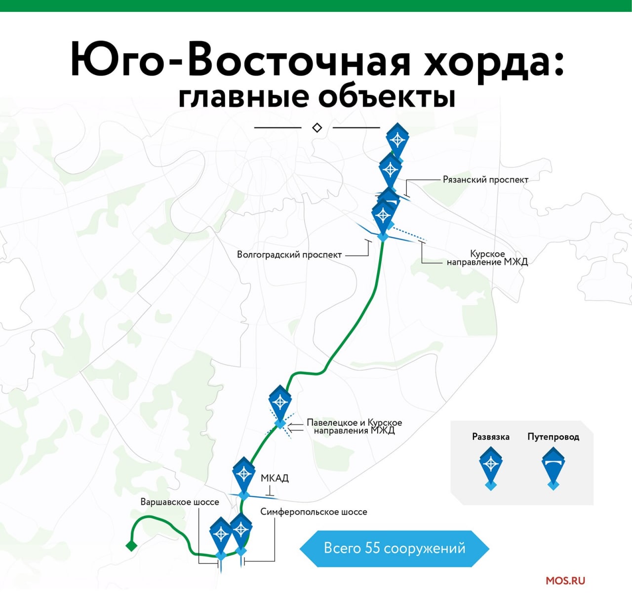 Общая длина основного хода Юго-Восточной хорды составит 28 км. Строительство ЮВХ планируется завершить до конца 2023 года, ее запуск завершит формирование системы хордовых магистралей Москвы.