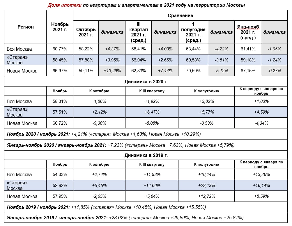 Ноябрь-2021 к ноябрю-2020: доля ипотеки выросла на 3,41%, причем основной рост +12,20% пришелся на Новую Москву, а доля в “старой” Москве немного снизилась. По сравнению с ноябрем 2019 года, в ноябре-2021 доля ипотеки в Новой Москве выросла на 17,36%, а в “старой” Москве на 9,32%.