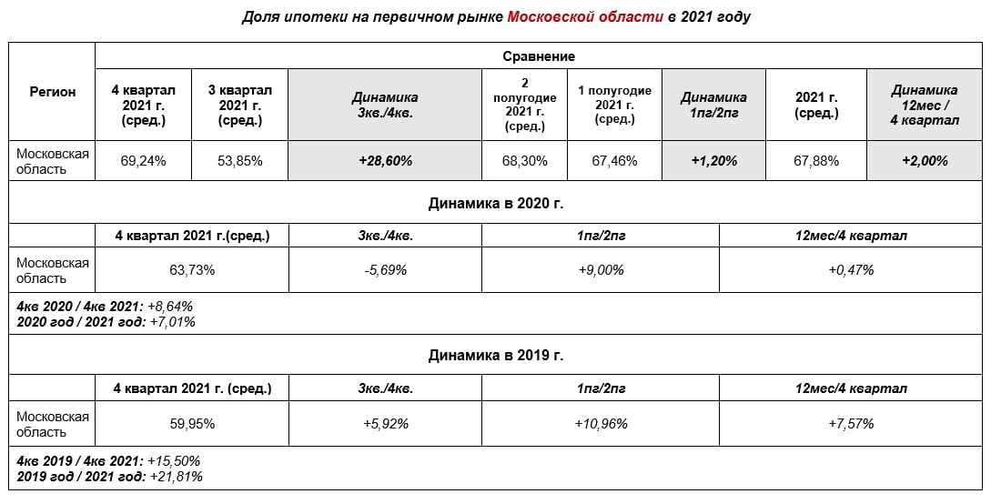 И, наконец, аналитика по доле ипотеки в Московской области. Данные Росреестра за 4 квартал 2021 года сравнили с средними показателями 3 квартала и всего года, 2 полугодие – с первым, не забыли и о динамике в 2020 и 2019 годах. Таблица внизу, кликайте, чтобы увеличить.