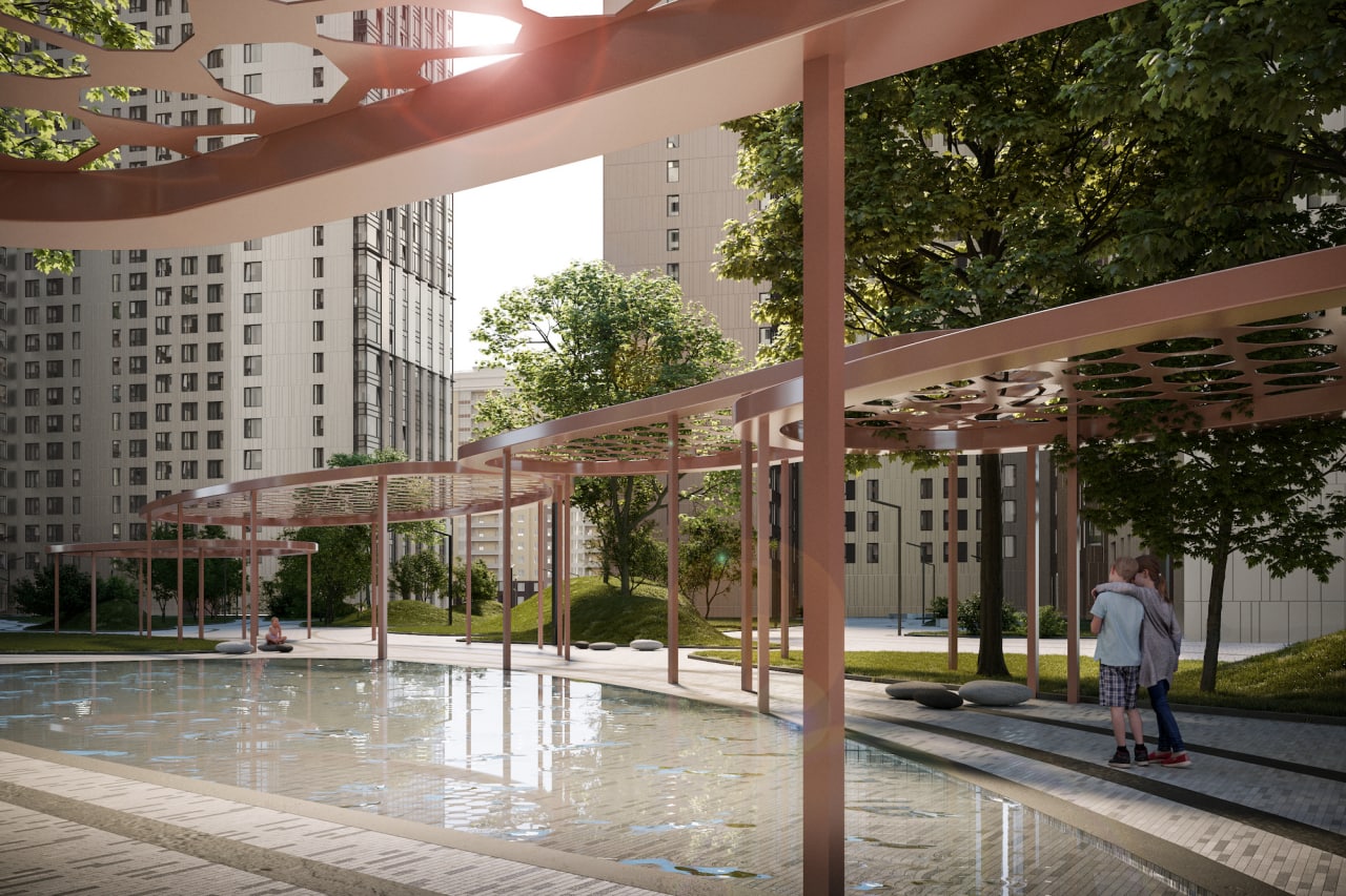 Двор квартала посвящен теме воды: оформление детских и спортивных площадок, мест для отдыха, ландшафтный дизайн. В центре двора будет обустроена прогулочная дождевая аллея с водной растительностью вдоль дорожек.