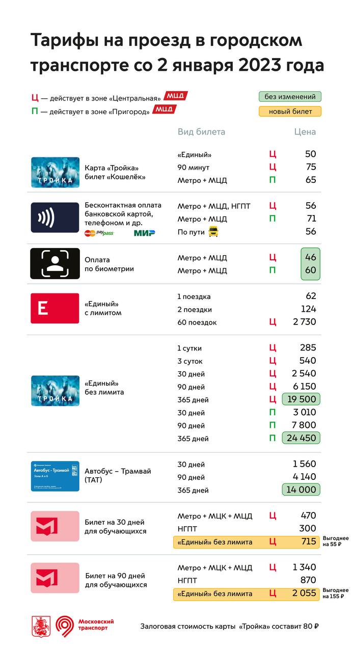Станет дороже проезд в наземном транспорте, метро, МЦК и МЦД (зона «Центральная») по карте «Тройка»: за разовую поездку нужно будет заплатить 50 рублей, а по тарифу «90 минут» — 75 рублей. На 1 рубль подорожает разовая поездка по «Единому» билету — до 62 рублей.