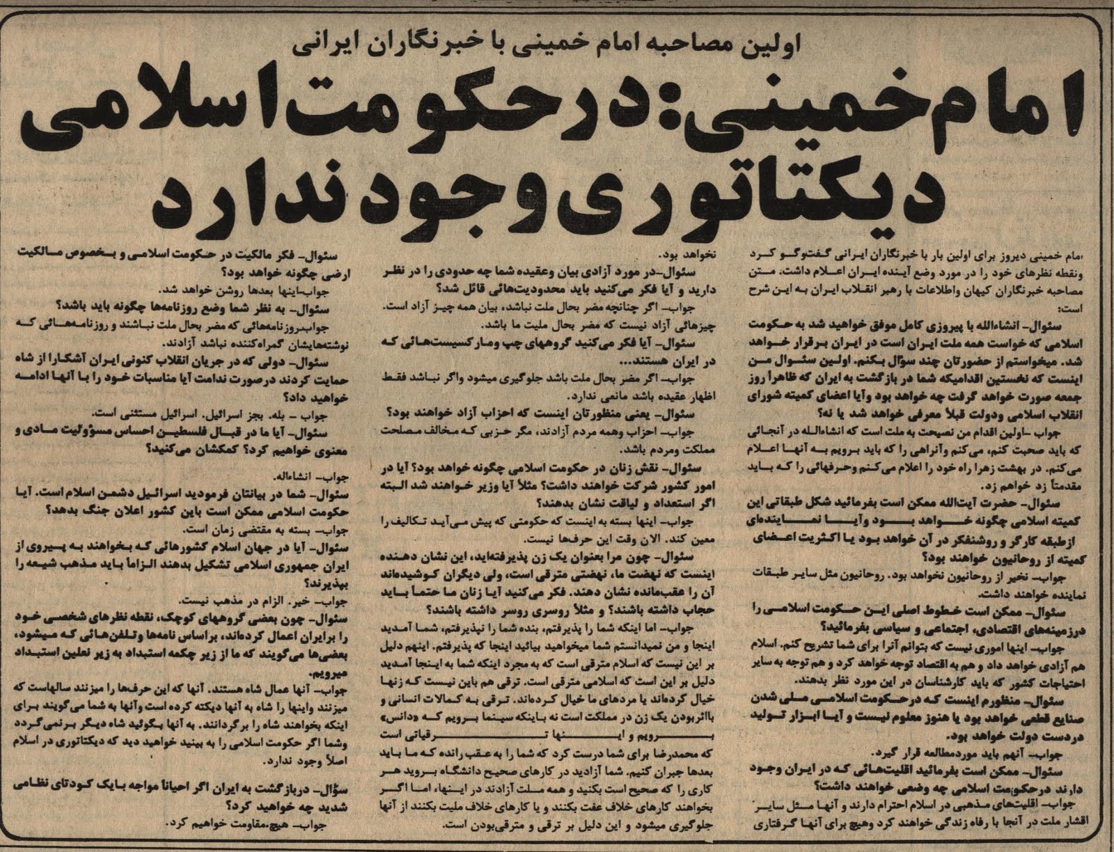 چهل سال پیش؛ یعنی دقیقا سوم بهمن ماه سال 1357 روزنامه «اطلاعات» مصاحبهای که با امام خمینی در نوفللوشاتو فرانسه ترتیب داده است را به صورت کامل پیاده و چاپ میکند. ظاهرا این اولین مصاحبه امام با خبرنگاران ایرانی در آن دوره -احتمالا بعد از تبعید- بوده. در میان مصاحبهکنندگان نیز خانم «نوشابه امیری» خبرنگار روزنامه «کیهان» حضور داشته و سوالاتی میپرسد.