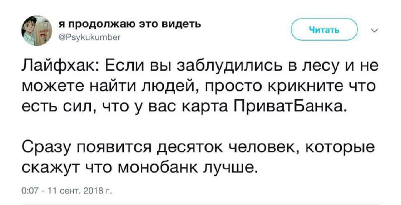 Прошло почти два года, а смешнее шутки про monobank до сих пор не встречал :)