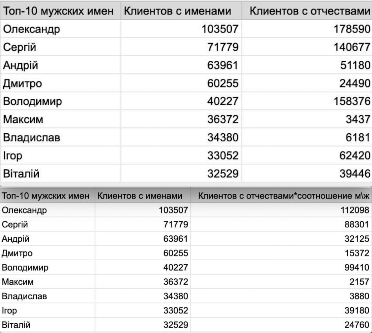 Во второй таблице отчества откорректированы на процентное соотношение мужчин и женщин в нашей базе.