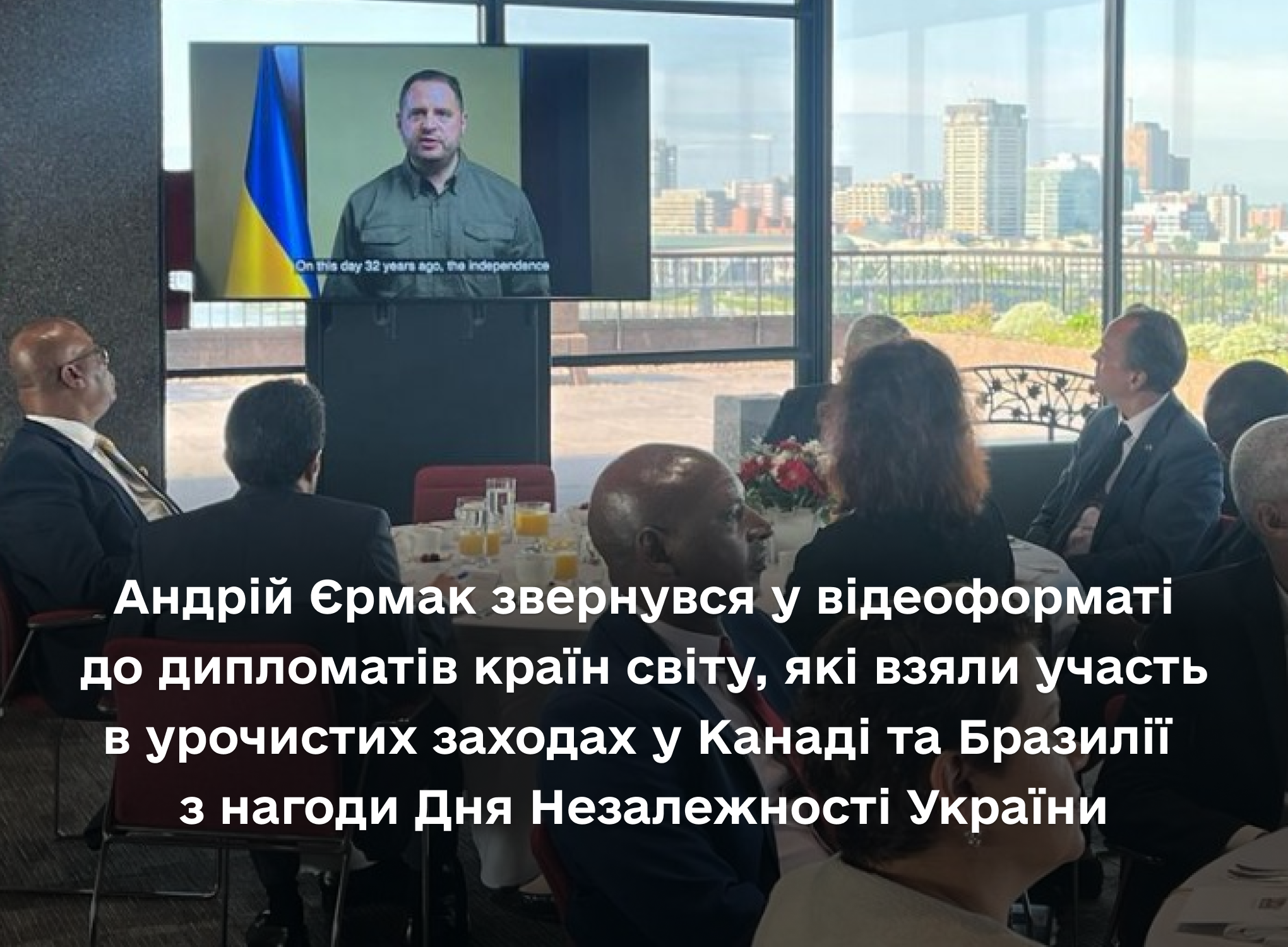 Керівник Офісу Президента України Андрій Єрмак звернувся у відеоформаті до учасників урочистих сніданків у Канаді та Бразилії, організованих із нагоди 32-ї річниці незалежності України.