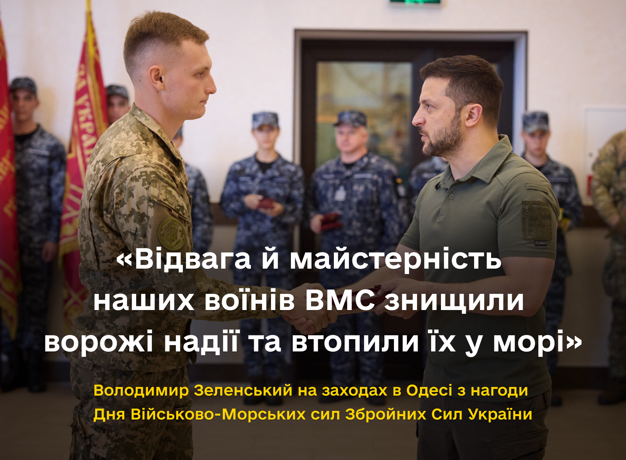 «Сьогодні – в Одесі, перш за все для того, щоб привітати наших воїнів Військово-Морських сил Збройних Сил України із їхнім професійним днем. Привітати – і подякувати за сміливість, за героїзм та за надзвичайно круті результати для України, які вони здобули та здобувають. Достатньо лиш згадати, які амбіції були у Росії на початку повномасштабної агресії та які з тих амбіцій тепер – на дні Чорного моря. Я дякую кожному воїну Військово-Морських сил України: усім морякам, усім морпіхам, усім командирам наших ВМС, артилеристам, морським авіаторам, операторам безпілотників, дякую воїнам річкової флотилії, річкових дивізіонів… Дякую!»