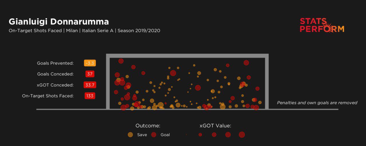 Согласно статистической модели xGOT(качество ударов в створ ворот), которая дает представление о том, сколько голов пропустит средний вратарь, учитывая качество позиции с которой наносится удар(xG) и то в какую именно часть ворот наносится удар, Доннарумма предотвратил больше голов, чем эта модель ожидала от него в 3 из 5 сезонов, будучи основным голкипером «Милана».