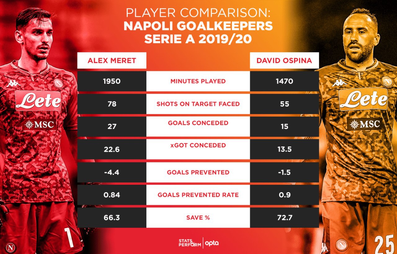 Оспина так же не смог порадовать болельщиков, закончив оба сезона с отрицательным значением предотвращенных мячей ( -3.37 в 2018/19 и -1.5 в 2019/20) это значит, что он пропустил больше голов, чем мы ждем от среднего вратаря серии А, отталкиваясь от качества ударов, которые наносились по его воротам.