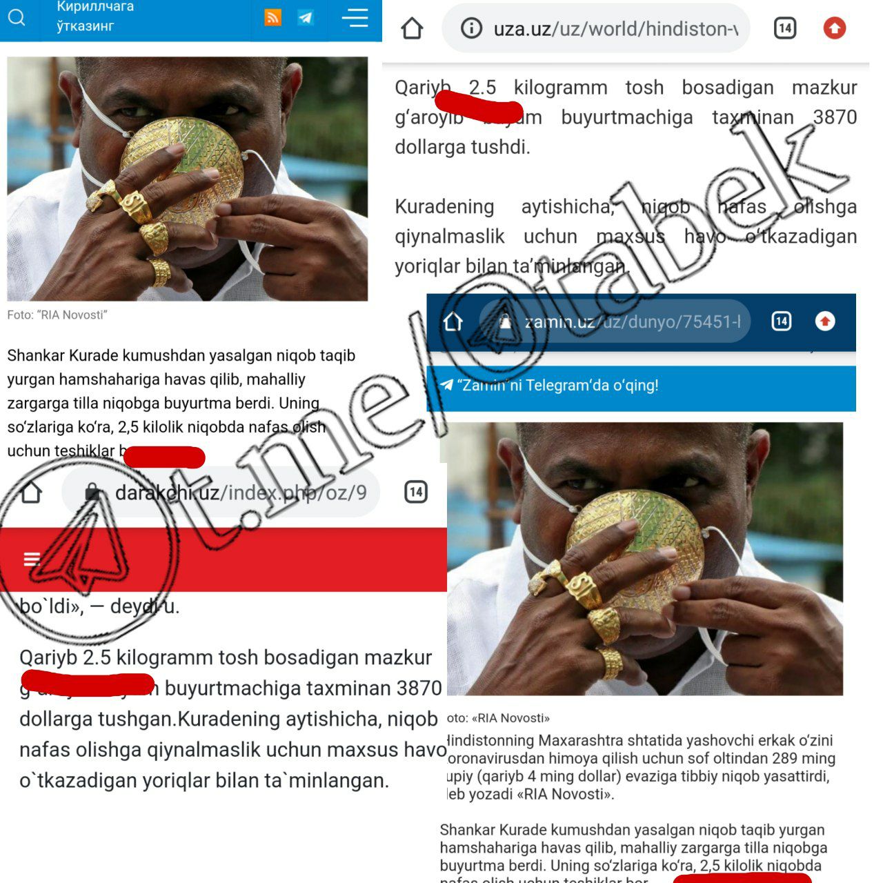 Бир муддат аввал "Daryo.uz, Uza.uz, Darakchi ва Zamin.uz" нашрларида, ижтимоий тармоқларда, жумладан анчагина телеграм каналларида ҳам 4000 долларлик олтин ниқоб ясатган Ҳиндистонлик ҳақидаги маълумот роса мавзуга айланди.