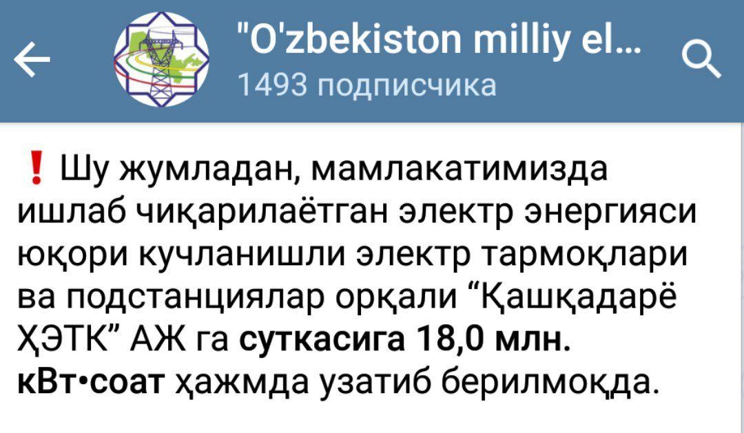 Холбуки Қашқадарёнинг кунлик эҳтиёжи 18.0 млн кВт соатдан кўпроқни ташкил этишини дайди итлар ҳам билади, энди сизларга савол ҳурматли «Миллий электр тармоқлари» АЖдагилар, нега айнан 18.0 млн кВт соат, нега 22 ёки 28 млн кВт эмас, бу 18.0 млн кВт соатни қайси эҳтиёжга қараб беряпсизлар ана энди шунисини айтинглар?.