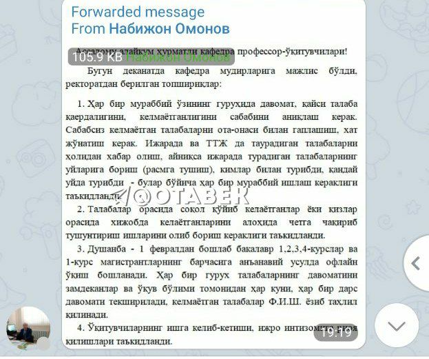 Орадан вақт ўтиб, Олий таълим вазирлиги матбуот котиби Фарҳод Бабашев вазирликда бундай топшириқ бўлмаганини маълум қилди. Вазирликка кўра, айни вақтда ҳолатга ойдинлик киритиш ишлари олиб борилмоқда.