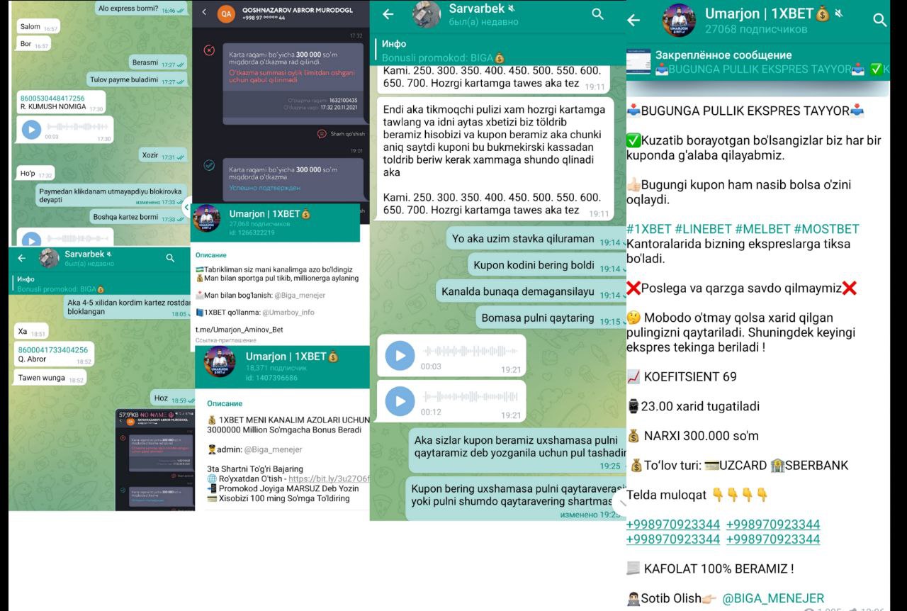 Улар қандай тартибда ишлашади, хўш 2 та катта канал орқали юқори коэффцентли купонларни сотамиз деб эълон беришади, купон олиш истагида уларни картасига пул ўтказганлар шунчаки блокланади ёки ўзимиз пул тикиб берамиз, тикмоқчи бўлган пулингизни ҳам бизга ўтказинг деб лохларни 2 карра тунашади.
