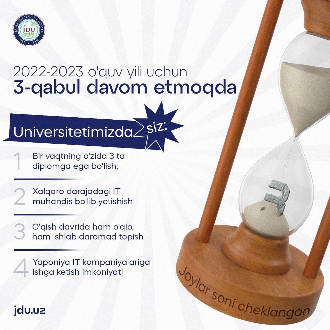 Japan Digital University'da 2022-2023-o'quv yili uchun 3-mavsum qabuli tugashiga 7 kun qoldi!