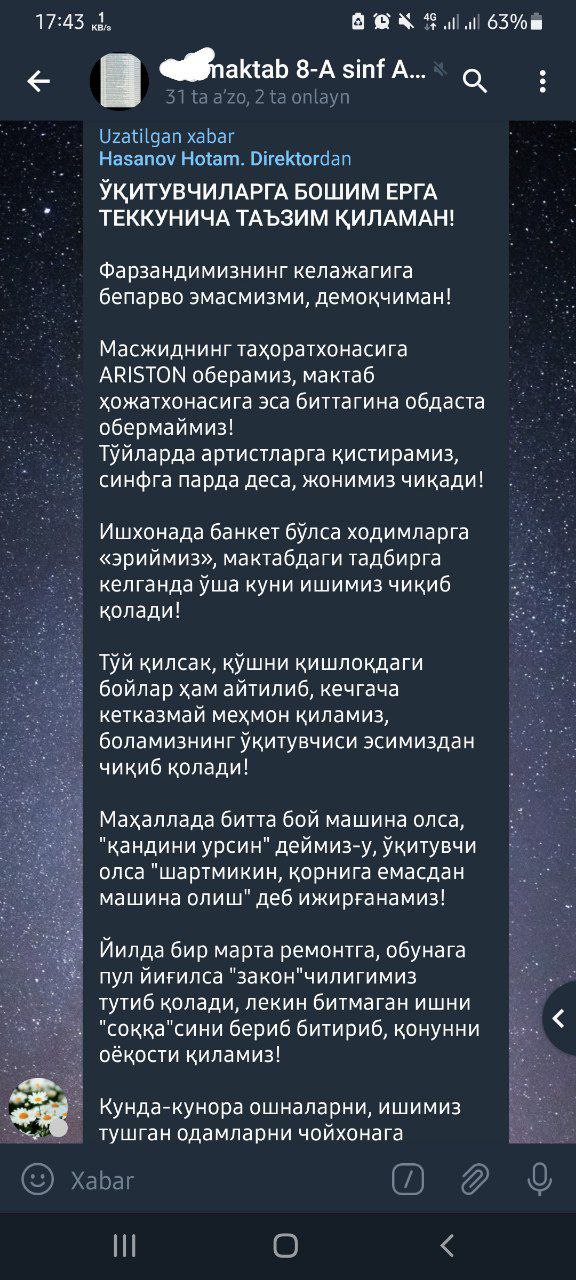 Бўлса беринглар мен ўзим ўқитувчиларни ҳимоя қиламан, бўлмаса йўлимдан чиқманглар ва директор буйруқ берганда қандай ерга қараб жим ўтирган бўлсанглар ҳозир танқидларга ҳам шундай қилинглар☝️