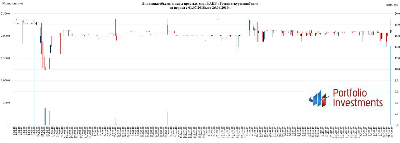 Напомним, что по итогам 2017г. было выплачено 38 тийин на одну простую акцию, что составляет чуть больше 2% от рыночной стоимости акций (текущая котировка 17 сум за акцию).