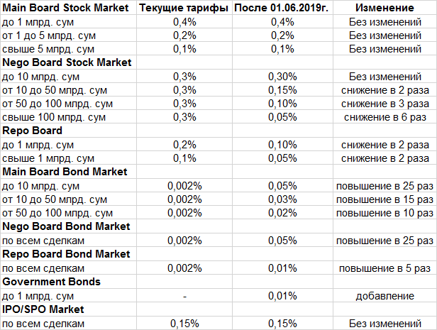📣 Республиканская фондовая биржа "Тошкент" объявила об изменении тарифов за проведение биржевых торгов с 01.06.2019г.