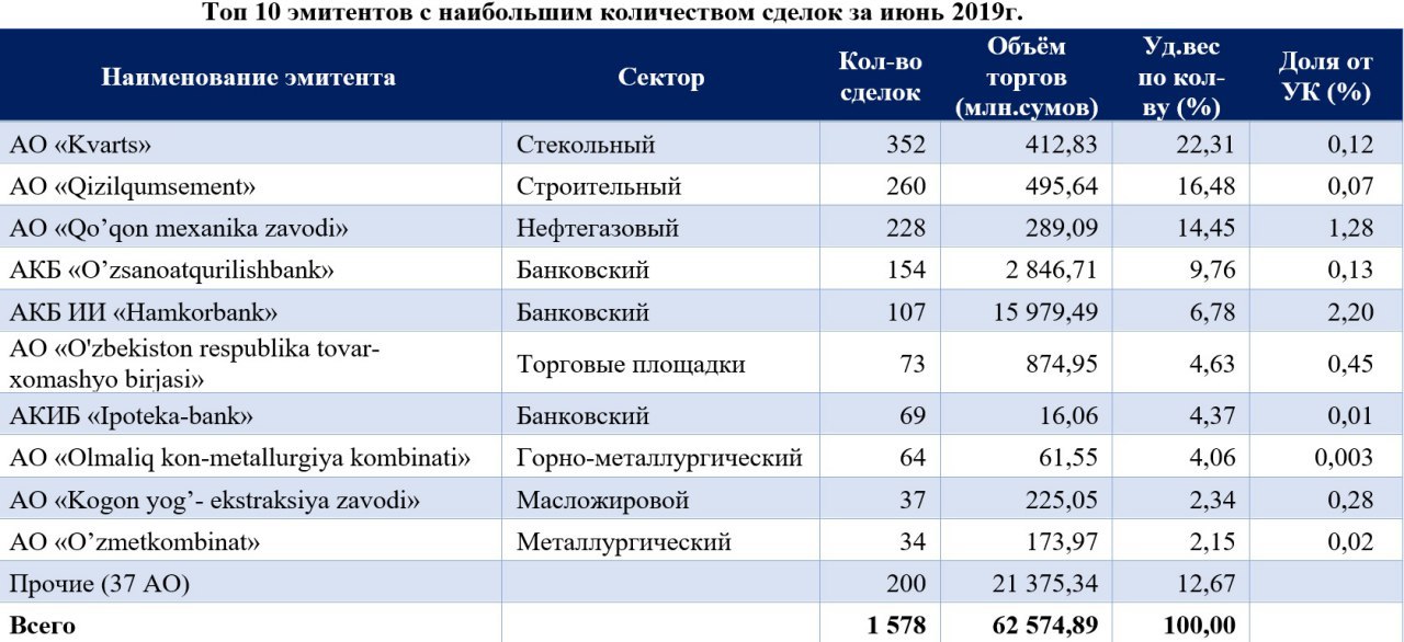 🤼♂️ По количеству сделок в июне следом за акциями AО «Kvarts» (352 сделки) идет АО «Qizilqumsement» (260 сделок), а также АО «Qo’qon mexanika zavodi» (228 сделок), что составляет 22,31%, 16,48% и 14,45% от общего количества биржевых сделок.