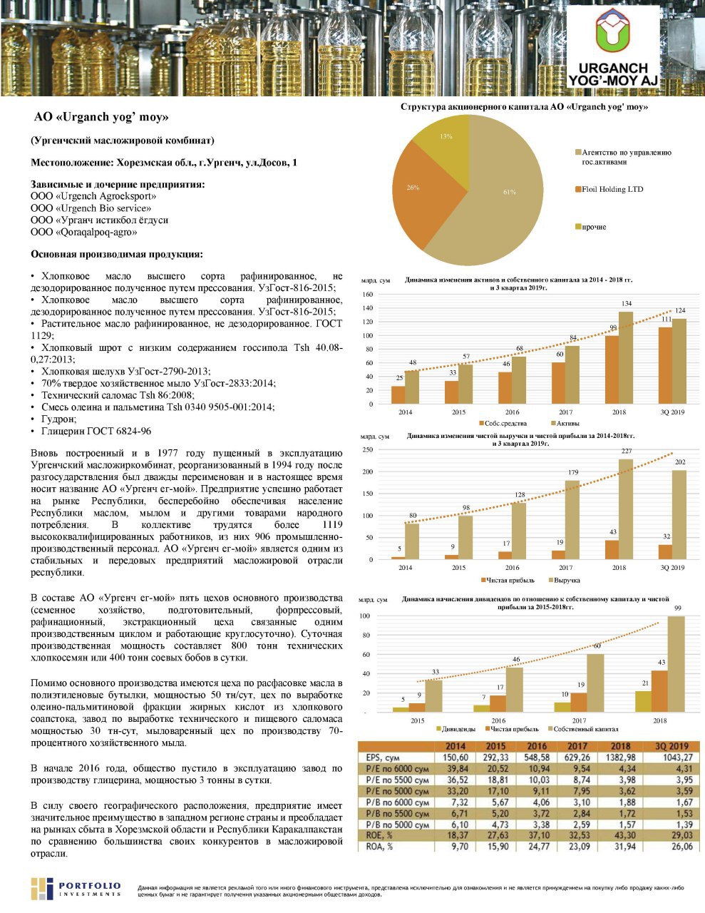 Лидером масложировой отрасли Узбекистана является АО "Urganch yog'-moy" который опубликовал отчет за 3 кв. 2019 года. По итогам трех кварталов 2019 года относительно аналогичного периода 2018г.: