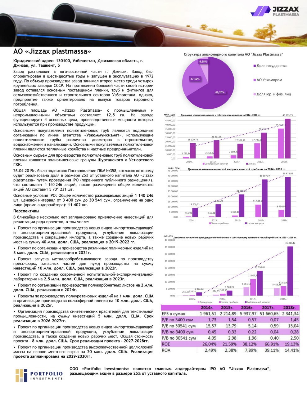 📣📣📣 В качестве главного андеррайтера IPO АО «Jizzax plastmassa» торжественно объявляем о том, что такая возможность вновь появилась. Организация данного проекта будет проводиться со стороны ООО «Portfolio Investments» с возможностью создания синдиката андеррайтеров для остальных профессиональных участников. ООО «Portfolio Investments была признана Лучшим инвестиционным посредником 2016-2017гг.🥇 и Лучшим инвестиционным консультантом 2018 года🥇 со стороны Агентства по развитию рынка капитала (ранее Центр по координации и развитию рынка ценных бумаг). 🎓