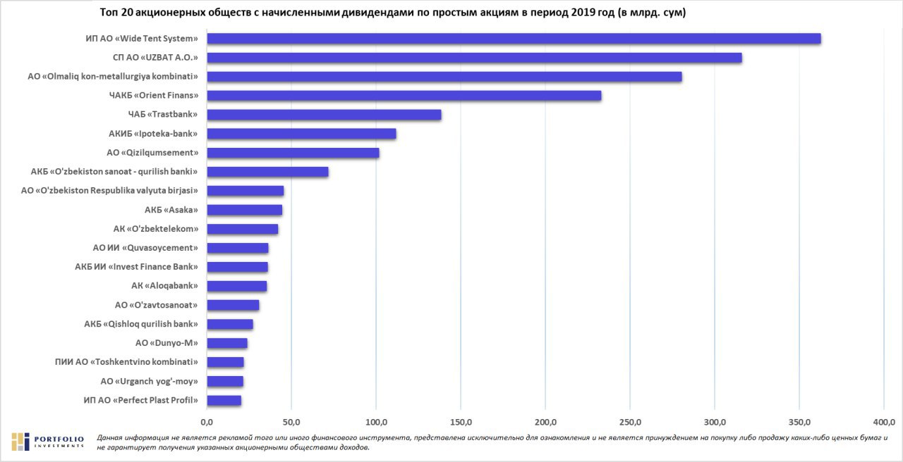 🤩 Всего сумма начисленных дивидендов составила 2379.34 млрд. сум, из них Топ 20 эмитентов начислили 1996.51 млрд. сум, что составляет 83.91% от всей суммы дивидендов объявленные в 2019 году по сегодняшний день.