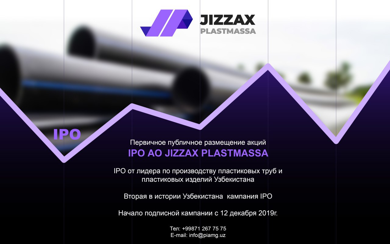 Гражданам и юридическим лицам будет предложена доля АО «Jizzax plastmassa» в размере 25% от существующего уставного капитала путем первичного публичного размещения – IPO (initial public offering). 🤩