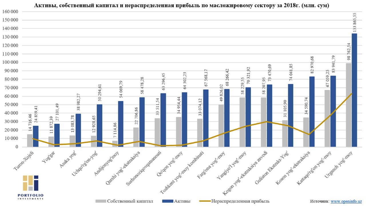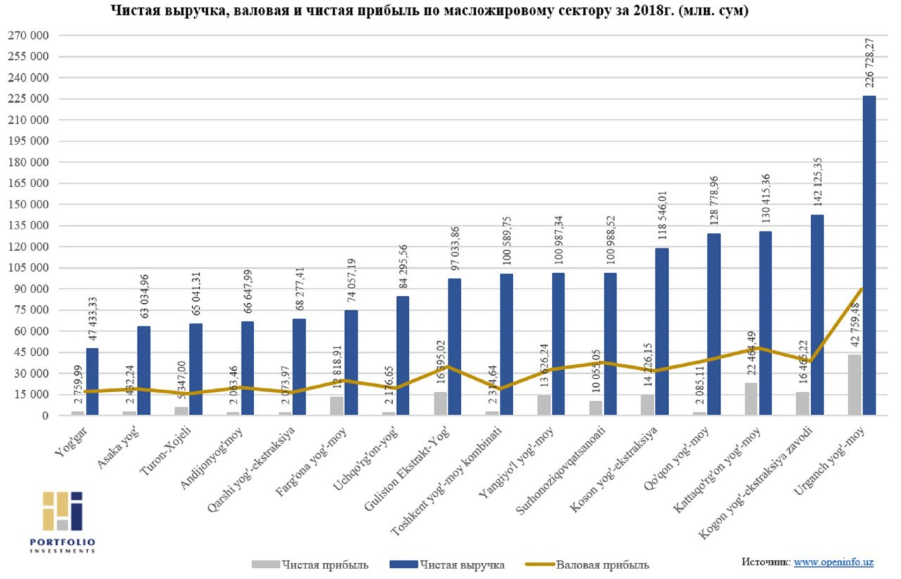 🥇 С существенным преимуществом среди 17 акционерных обществ масложирового сектора, лидером по объему выручки по итогам 2018г. стало АО "Ургенч ег-мой" с выручкой в размере более 226,7 млрд. сум и чистой прибылью около 42,8 млрд. сум.