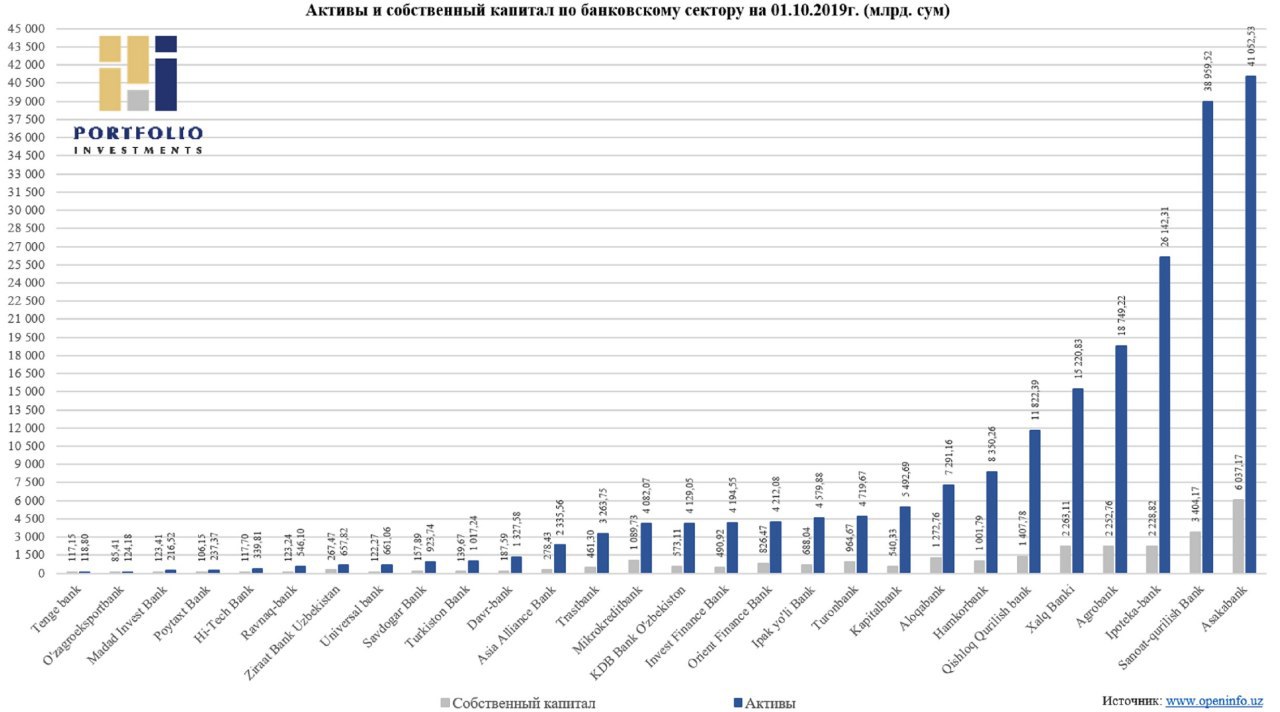 🔍 Согласно опубликованному квартальному отчету на 01.10.2019г. у 28 коммерческих банков Узбекистана совокупные активы составляют 210,7 трлн. сум. (22,1 млрд. долларов США), размер собственного капитала составляет 27,3 трлн. сум. (2,9 млрд. долларов США)