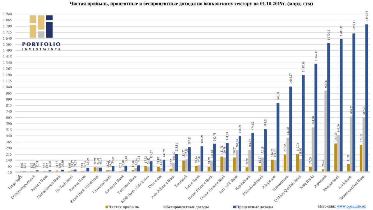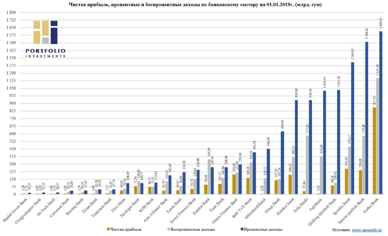 🔍 По состоянию на 01.01.2019г. согласно опубликованному годовому отчету 26 коммерческих банков проведенный анализ основных финансовых показателей по процентным и безпроцентным доходам 26 коммерческих банков Узбекистана достиг суммы в размере 17,54 трлн. сумов (1,84 млрд. долларов США). Следует отметить, что с точки зрения выручки по всем банкам процентный доход составил сумму вдвое больше беcпроцентного дохода.