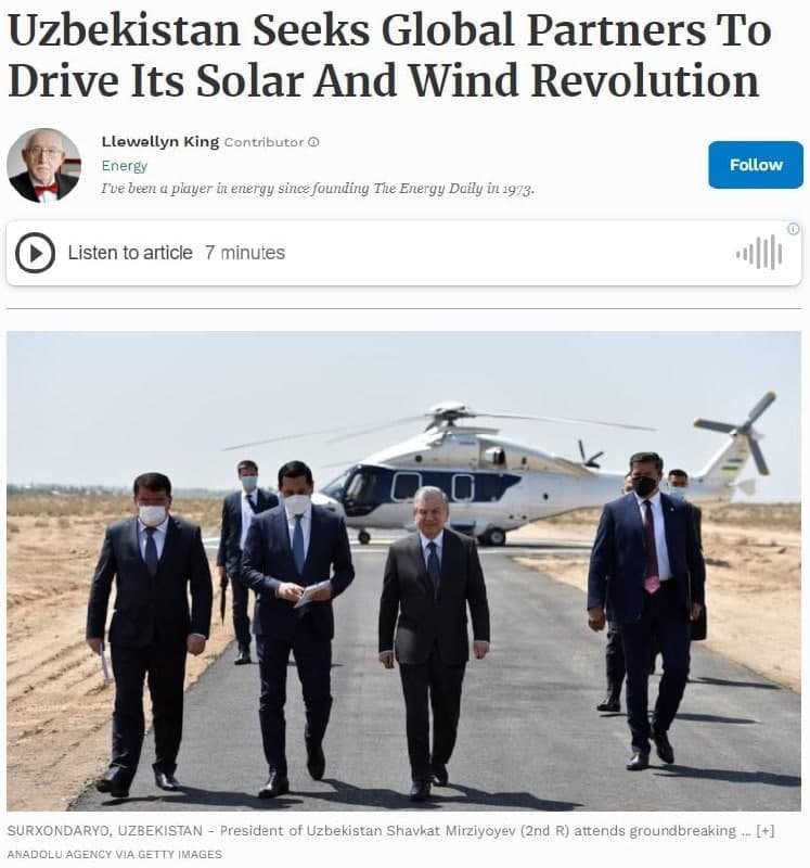Муаллиф Л.Кингнинг “Ўзбекистон ўзининг қуёш ва шамол инқилобини илгари суриш учун глобал ҳамкорлар изламоқда” номли материалида Ўзбекистон Президенти Шавкат Мирзиёев ташаббуси билан қабул қилинган Стратегия энергетика тизими қуёш энергиясига эътибор қаратган ҳолда яшил келажакни ўз-ўзидан ривожлантиришга қаратилгани таъкидланган.