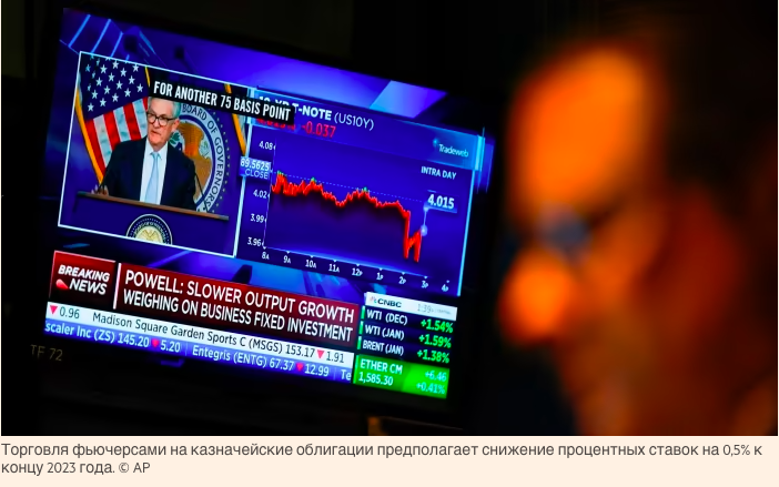 Они считают, что процентные ставки начнут снижать, когда в следующем году ФРС столкнется с замедлением экономики. Трейдеры на рынке государственных облигаций США делают ставку на то, что ФРС будет вынуждена дважды снизить процентные ставки в четвертом квартале 2023 года