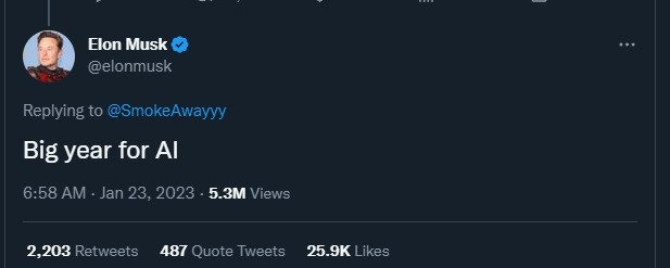 Самый богатый человек планеты твитнул, что 2023 будет большим годом для ИИ(AI). Понятно что у Маска есть личный интерес, ведь его компания вживляет чипы макакам и поросятам и это хорошая возможность для привлечения инвестиций. Притом я сомневаюсь что Маск будет сам инвестировать, скорее только привлекать. Ну это же Маск...