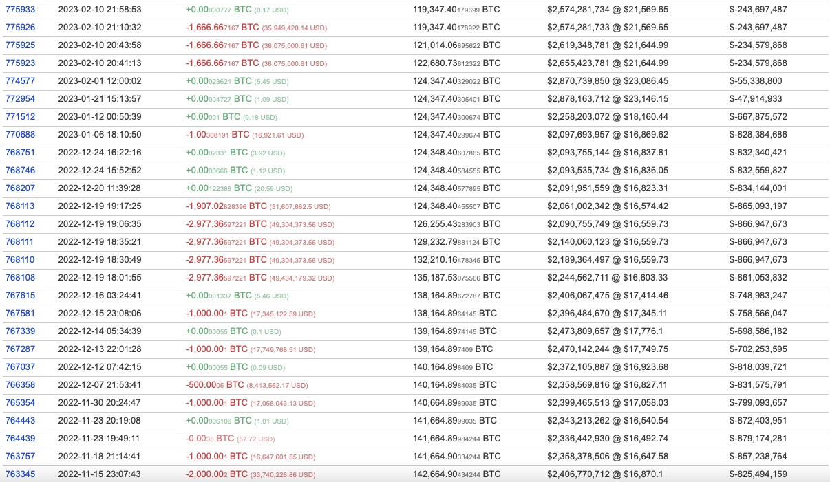 За последние 4 месяца с его кошелка было переведено 25 000 BTC, по средней цене 21 000$, что примерно равно 0.5 млрд $. Последние 3 перевода были сделаны 10 февраля мифическими суммами по 1,666.66 BTC. Тем временем баланс кошелька снизился с 142k BTC, до 119 BTC, уступив третью строчку еще одному кошельку Binance(127k BTC).
