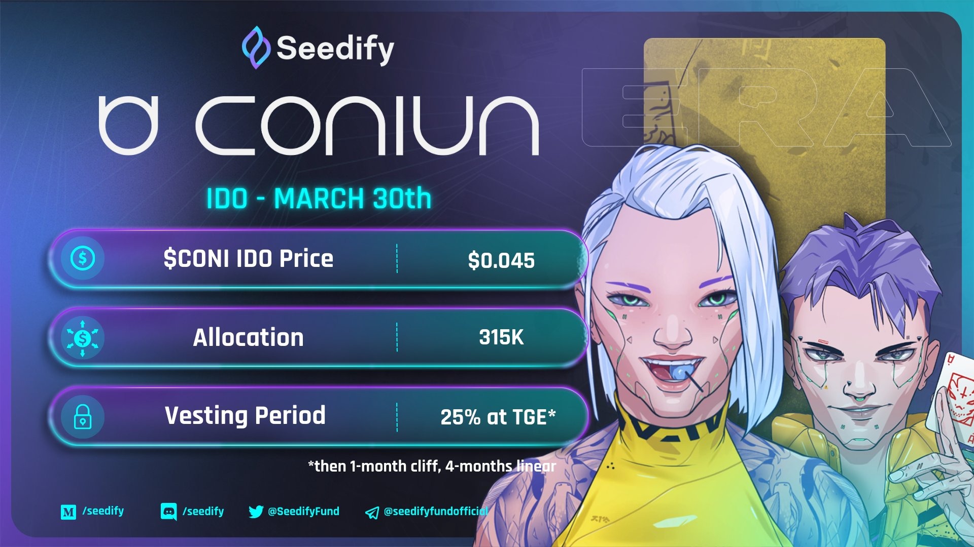 30 марта был сейл на площадке Seedify и прошел он бодро(выкупили токен быстро), что является добрым знаком и предвестником иксов, на листинге, который состоится 5 апреля в 17:58 (мск/киев) на Uniswap. Через 2 минуты посте листинга, будет доступен клейм токенов CONI