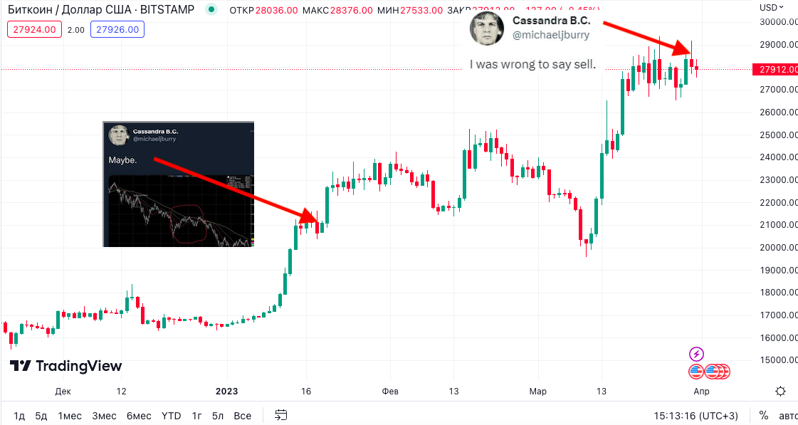 Если его призыв продавать был ловушкой(как считают многие), обращаю внимание на то что его признание совпало с текущим пиком BTC в 2023 году