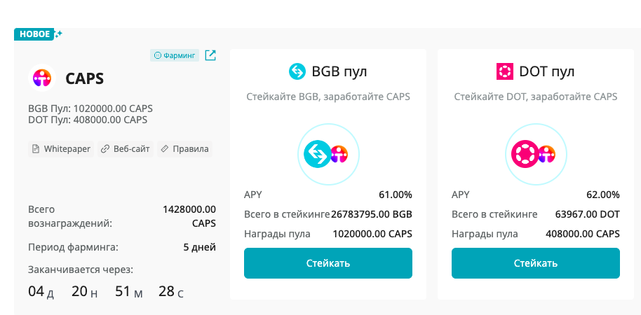 На бирже bitget проводится лаунчпул(Launchpool - позволяет вам бесплатно использовать свои токены для заработка нового токена). Можно за добавление в пул 2 DOT(13$) или BGB(32$) получить токенов CAPS(по сути бесплатно). Общий пул до 1 428 000CAPS