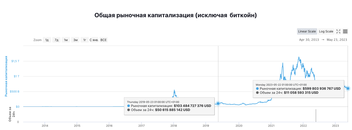 На самом деле, объем на торгах альтой ровно 4 года назад(23 мая 2019) был $50 млрд, а вчерашний объем торгов составил $11 млрд, что в 5 раз меньше.