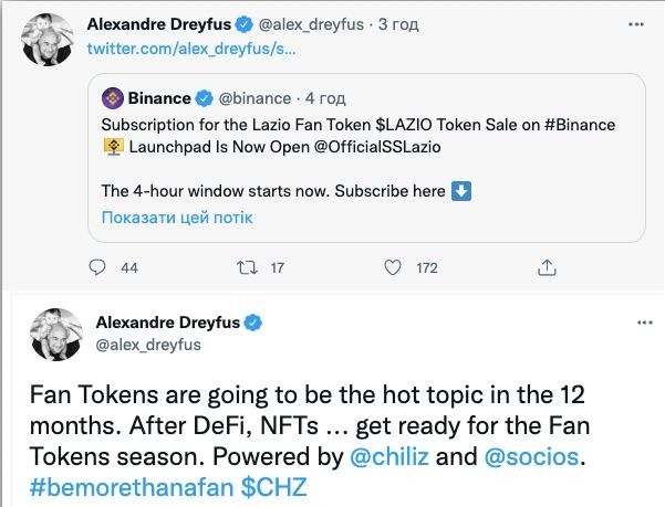 По началу, как только Бинанс объявил о футбольной серии лаунчпадов, нам показалось, что это конкуренция, но буквально перед стартом торгов токеном Лацио, стало ясно, что это масштабное сотрудничество Socios и Binance. А ясно стало когда, Dreyfus репостнул твит страницы Бинанса о листинге и прикрепил ссылку на свой твит двухдневной давности: "Фан-токены станут топ темой следующих 12 месяцев. После DEFI и NFT готовьтесь к сезону фан-токенов"