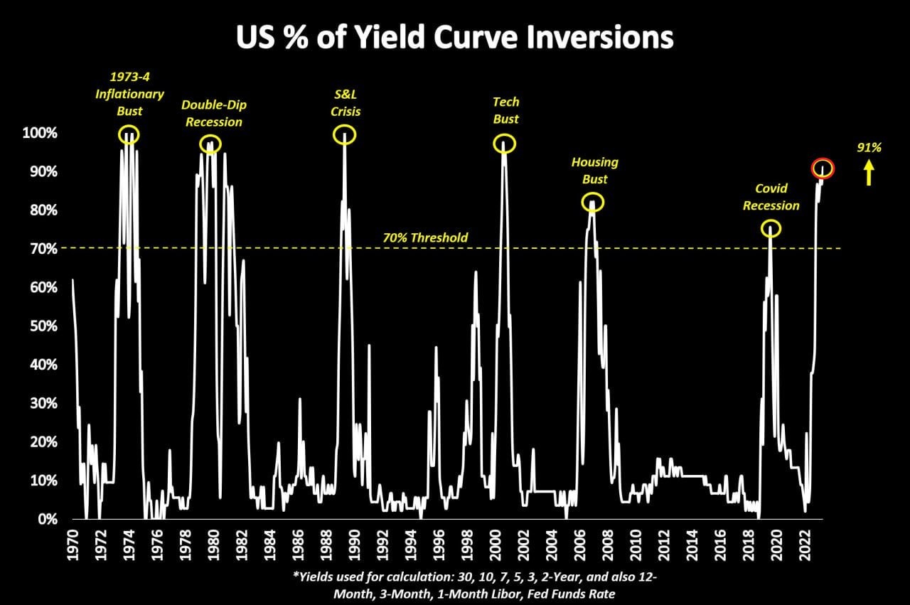 Основываясь на исторических данных, компания Crescat опубликовала графику инверсии кривой доходности и все кризисы в США(когда показатель инверсии был выше 70% - что по сути является критерием кризиса)