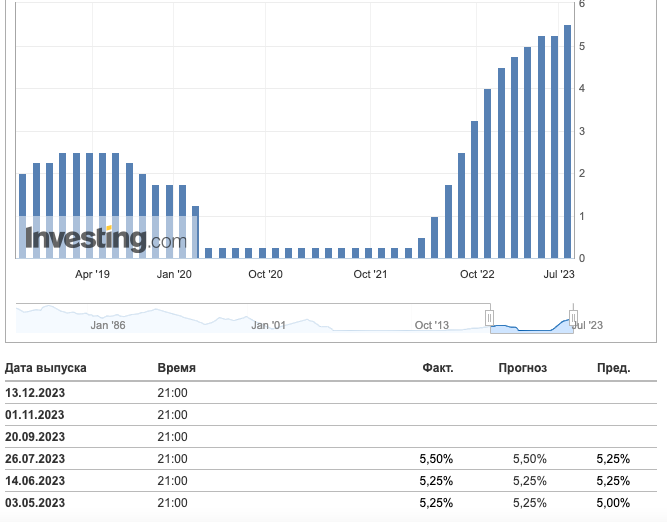 Мы ожидаем повышение ставки и в сентябре, т.к. ФРС, скорее всего, захочет увидеть еще несколько месяцев благоприятных данных по инфляции, прежде чем уверенно заявить прекращении повышений и начать удерживать ставку.