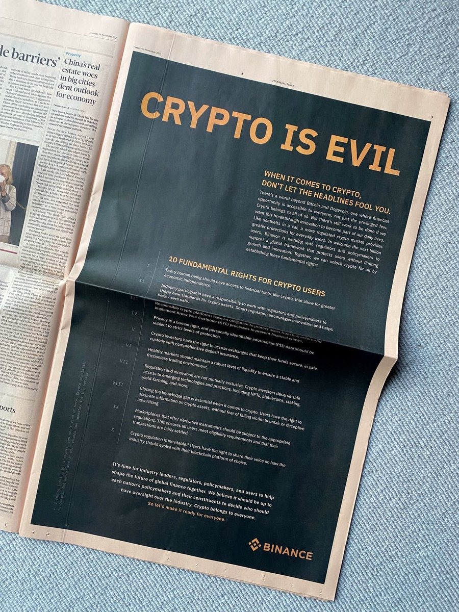 Вчера реклама Binance появилась в журнале Financial Times. Фото страницы загрузил в твиттер CEO биржи CZ и подписал: "приветствую новый миллиард криптоюзеров". Естественно он рассчитывает на наплыв новой аудитории непосредственно в его биржу. Поэтому, дальше будет только хуже, в плане участия в мероприятиях площадки. И мы больше не будем освещать подобные события, если они не покажут хорошей доходности. Целесообразней писать о падах, на которых действительно можно заработать, а не получать 1$ аллокации, за лок 1000$, в волатильном токене.