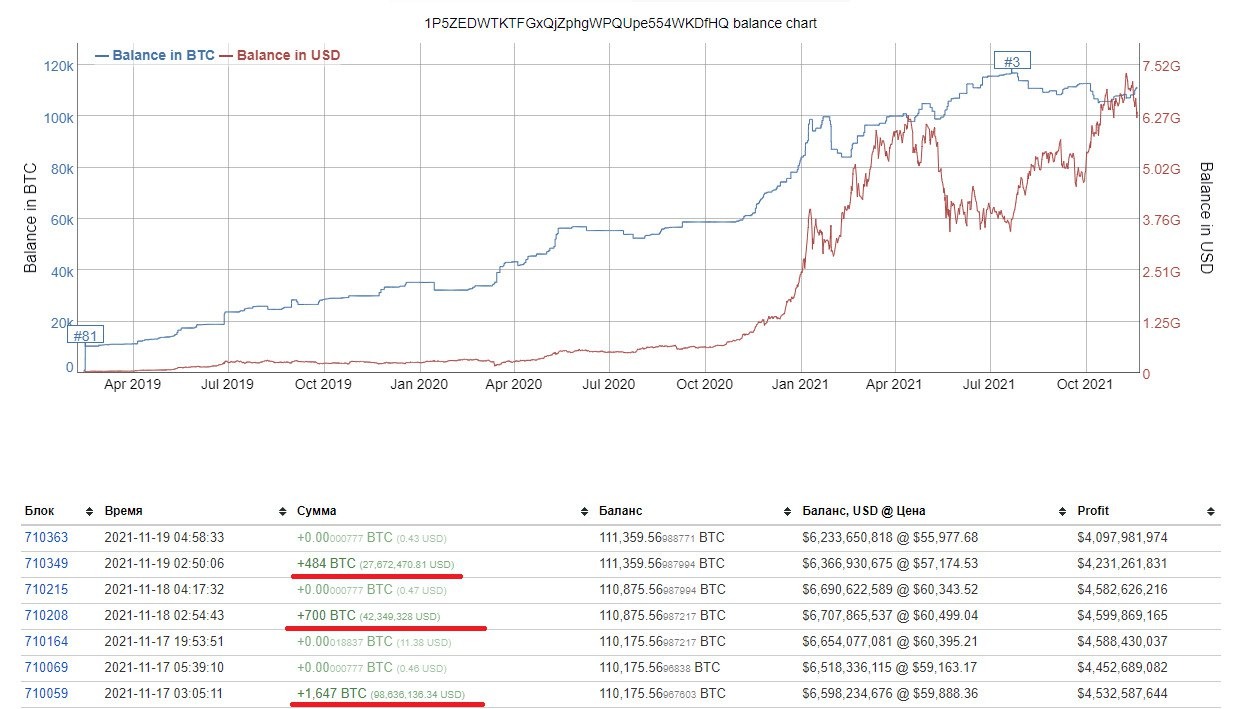 🐳 Этот же кошелек(топ-3 кит) откупил еще 2834 BTC за три дня. Напоминаю, что это третий по величине биткоин-кошелек. Его баланс 111359 BTC