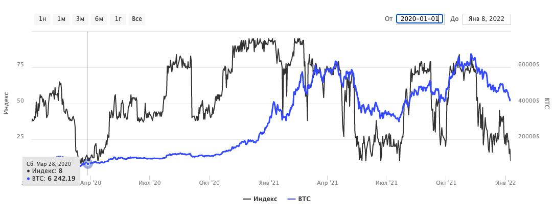 Индекс страха и жадности биткоина очень хорошо показывает настроение участников рынка и является отличным инструментом определения состояния эйфории или страха, для опытных инвесторов. И тот факт что мы находимся на столь низких отметках, на истории говорит, что разворот близко. А учитывая то что в зоне страха рынок находится уже 50 дней, вероятность увеличивается.