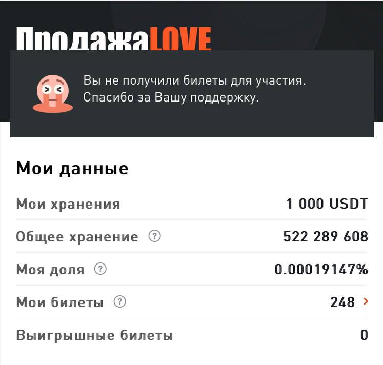 Сегодня завершилась эта тема с новым видом сейла PrimeList мы вкинули как писали, демонстративную 1000 USDT в качестве эксперимента, нам выпало 248 билетов(хотя я ждал 1000, как указано в правилах, но оказалось, что лок средств не даром был за 5 дней до сейла, механизм таков, что те кто залочили в первый день подучили 1 билет за 1 USDT, а те кто в последний, условно 1 билет за каждые 4 USDT, по принципу кто раньше внес, тот больше получил.), но в итоге, за 2 часа до сейла пришло уведомление, что выигрышных билетов среди них не оказалось.