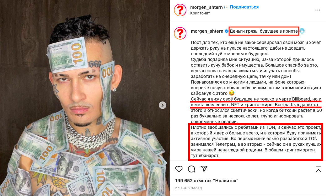 Примерно в одно время с последним постом, на инсте Моргенштерна вышла публикация, в которой артист принимает душ, используя вместо мочалки деньги(100 долларовые купюры). Подписано это было так: Деньги убожество, будущее в крипте. Спустя час курс TONCOIN прибавил еще 10%. В итоге за сутки только на слухах и намеках ТОН имеет +30% в цене. Еще позавчера капитализация монеты составлял 3.2 млрд, а сегодня достигала 4.8 млрд $. Это при том, что сам Морген, согласно данным его нового "СМИ" потратил 10 млн рублей на покупку крипты. Это 132k $. Такая покупка не изменила бы курс даже на цент, но цена изменилась с 2.7$ до почти 4$.