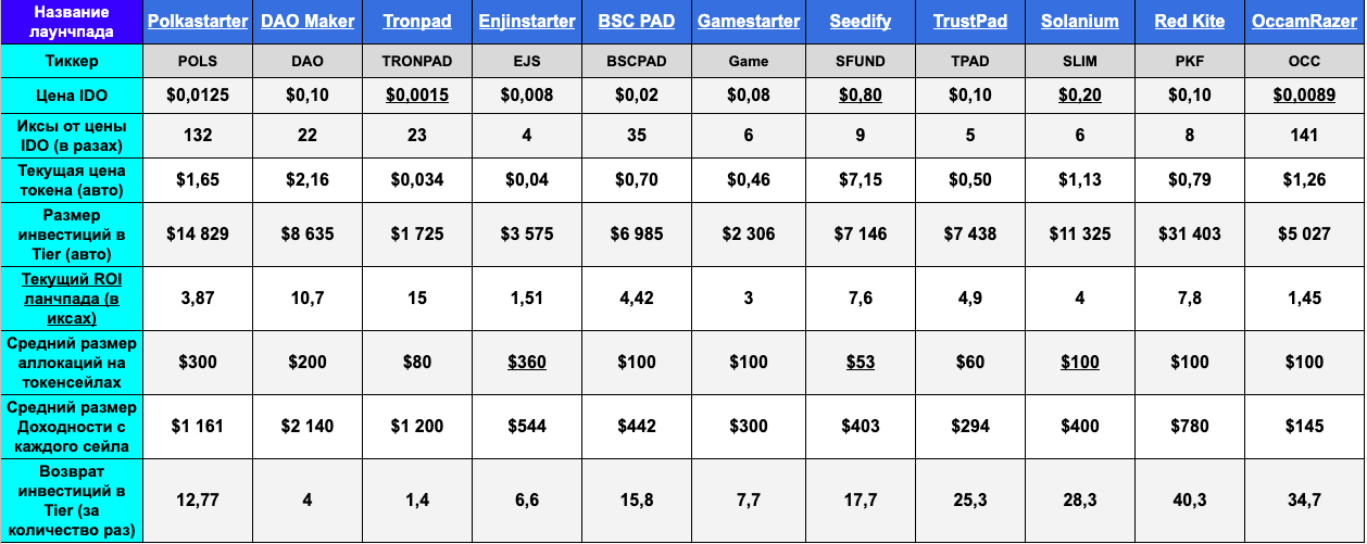 Из картинки можно узнать, сколько нужно денег для попадания в аллокации, сколько дают иксов "пады", какая средняя аллокация на сейлах и какой примерный доход с каждого сейла.