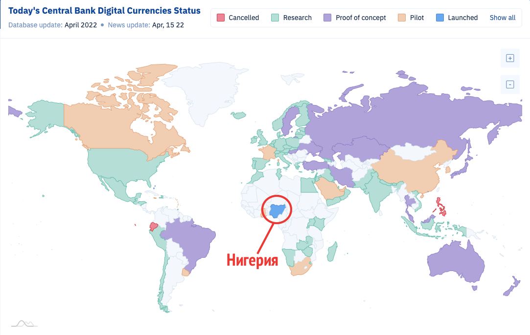 CBDC стало центральной темой в мире, практически каждая страна пытается разработать свою программу цифровой валюты и яркий пример тут Китай, который протестировал свой цифровой юань на зимней Олимпиаде. И в сети даже имеется карта прогресса государств в этой сфере и согласно данным, единственным принявшим цифровую валюту новатором стала Нигерия. Отслеживать можно тут: https://cbdctracker.org/