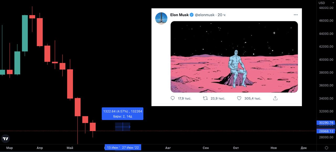 И кстати, тайный знак от Илона Маска тут тоже есть. Вчера он опубликовал человека на луне повернутого к нам лицом. Именно такого человечка, только с повернутым к нам спиной, он опубликовал 13 ноября(тоже суббота), в тот день BTC стоил 64k, а через 2 дня начал свое беспрепятственное снижение до текущих отметок. Если та картинка что-то означала, то сегодняшняя, по идее, должна быть предназначена для обратных целей. Будем надеятся что Маск передумал и вместо твиттера купит BTC на 40 млрд $. Ну или хотя бы просто попампит твиттами.