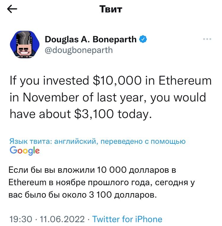 Ну и подогревает ситуацию подобные комментарии от лидеров мнения, что гонит цену второй криптовалюты вниз, а с ней и весь рынок. А в пятницу еще и повышение процентной ставки, на ряду с обновленными хаями инфляции. Пожалуй следующий рекорд будет за индексом страха и жадности
